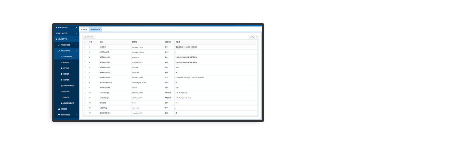 系統(tǒng)參數(shù)管理、機構(gòu)管理、用戶管理、權(quán)限管理、日志管理、文件服務設(shè)置、軟件注冊、數(shù)據(jù)遷移