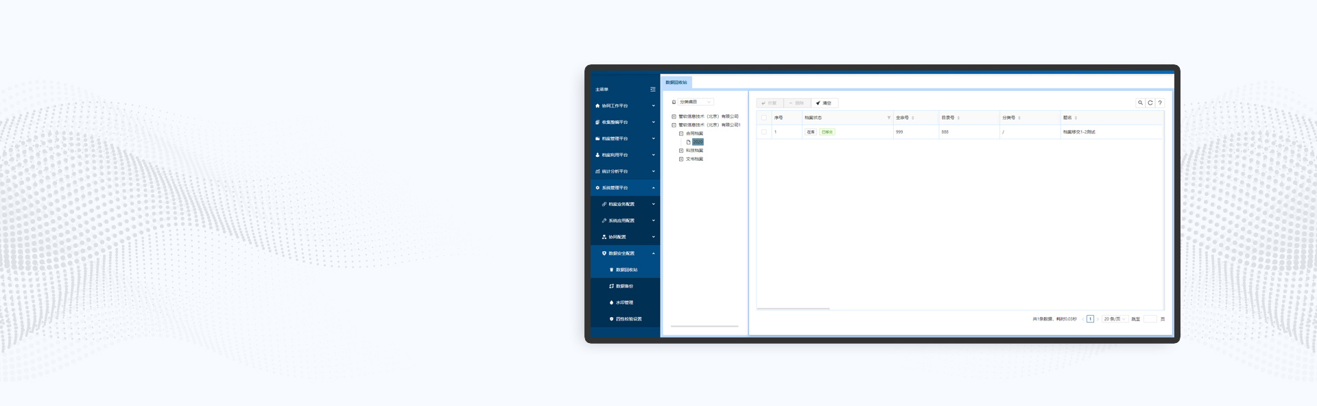 全宗管理、檔案門類管理、結(jié)構(gòu)模板定義、元數(shù)據(jù)管理、字典管理、數(shù)據(jù)報表管理、借閱模板管理、索引庫管理、分類庫管理、發(fā)布管理